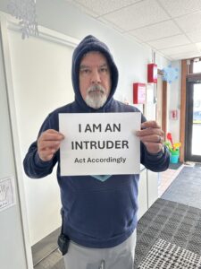- Matt printed out a sign that read, “I AM AN INTRUDER. Act Accordingly”. He put up his hoodie and started walking to all of our classrooms just holding up the sign. I followed closely behind watching and noting reactions.